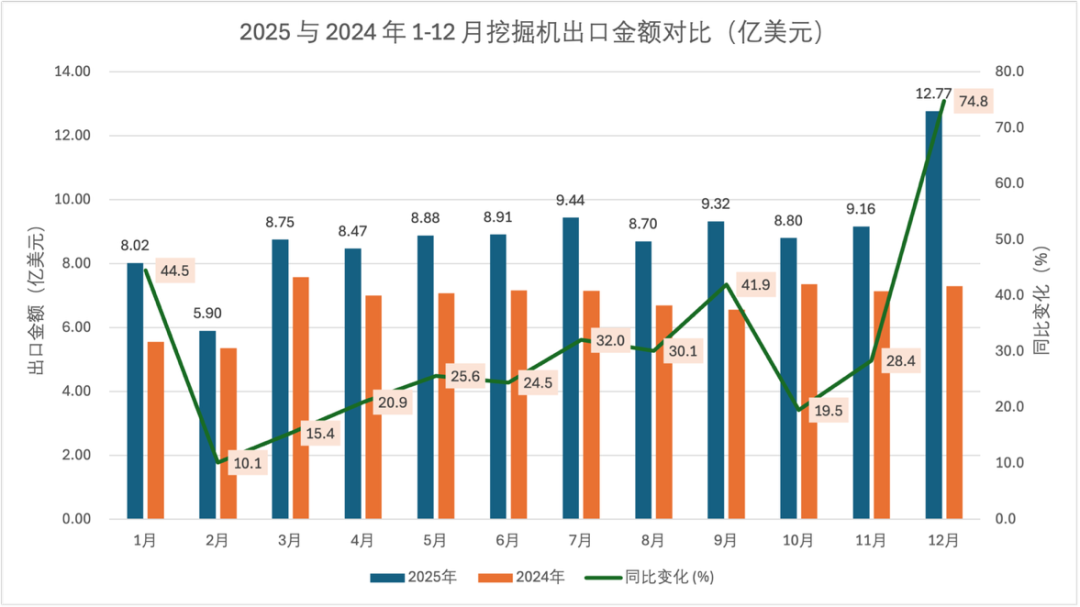 D'après les données mensuelles, les performances des exportations de pelles sur chenilles s'alignent étroitement sur celles du marché global, avec une valeur d'exportation sur un seul mois de 1,228 milliard de dollars en décembre, soit une augmentation de 74,0 % sur un an, et un volume d'exportation de 34 000 unités, en hausse de 65,0 % sur un an, démontrant une dynamique de croissance significative en fin d'année. En termes de variations d'une année sur l'autre, tant la valeur que le volume des exportations ont enregistré une croissance positive sur tous les mois, le volume de septembre ayant augmenté de 57,9 % et la valeur de décembre de 74,0 %, se distinguant comme les faits saillants de la croissance de l'année.
