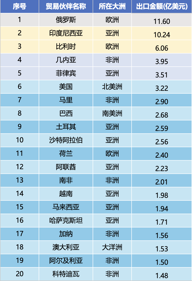 Dans le classement du montant des exportations de janvier à décembre 2025, les dix principaux partenaires commerciaux sont la Russie (1,16 milliard de dollars), l'Indonésie (1,024 milliard de dollars), la Belgique (606 millions de dollars), la Guinée (395 millions de dollars), les Philippines (351 millions de dollars), les États-Unis (322 millions de dollars), le Mali (290 millions de dollars), le Brésil (268 millions de dollars), la Turquie (259 millions de dollars) et l'Arabie saoudite (256 millions de dollars). La valeur totale des exportations des dix principaux marchés a atteint 4,93 milliards de dollars, soit 45,9 % de la valeur totale des exportations, avec une forte concentration sur le marché principal.