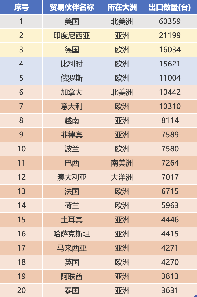 Selon le classement des quantités exportées de janvier à décembre 2025, les dix principaux partenaires commerciaux sont les États-Unis (60 359 unités), l'Indonésie (21 199 unités), l'Allemagne (16 034 unités), la Belgique (15 621 unités), la Russie (11 004 unités), le Canada (10 442 unités), l'Italie (10 310 unités), le Vietnam (8 114 unités), les Philippines (7 589 unités) et la Pologne (7 580 unités). Le volume total des exportations des dix principaux marchés a atteint 168 000 unités, soit 53,1% du volume total des exportations, soulignant l'effet d'échelle.